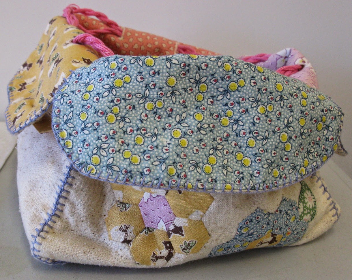 It is lined with 1930s fabrics, has pockets inside, and a drawstring closure. I'm afraid I didn't ask who designed it, though! The panels are stitched together with blanket stitch. One side is embellished with hexagons:
